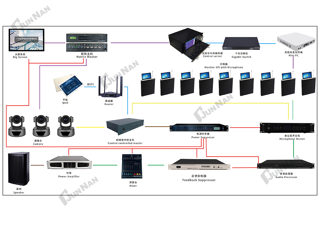 2)支持多会议管理功能,支持多会议室合并召开同一会议,或者一个会议室召开不同会议,或者不同的会议室召开不同的会议;